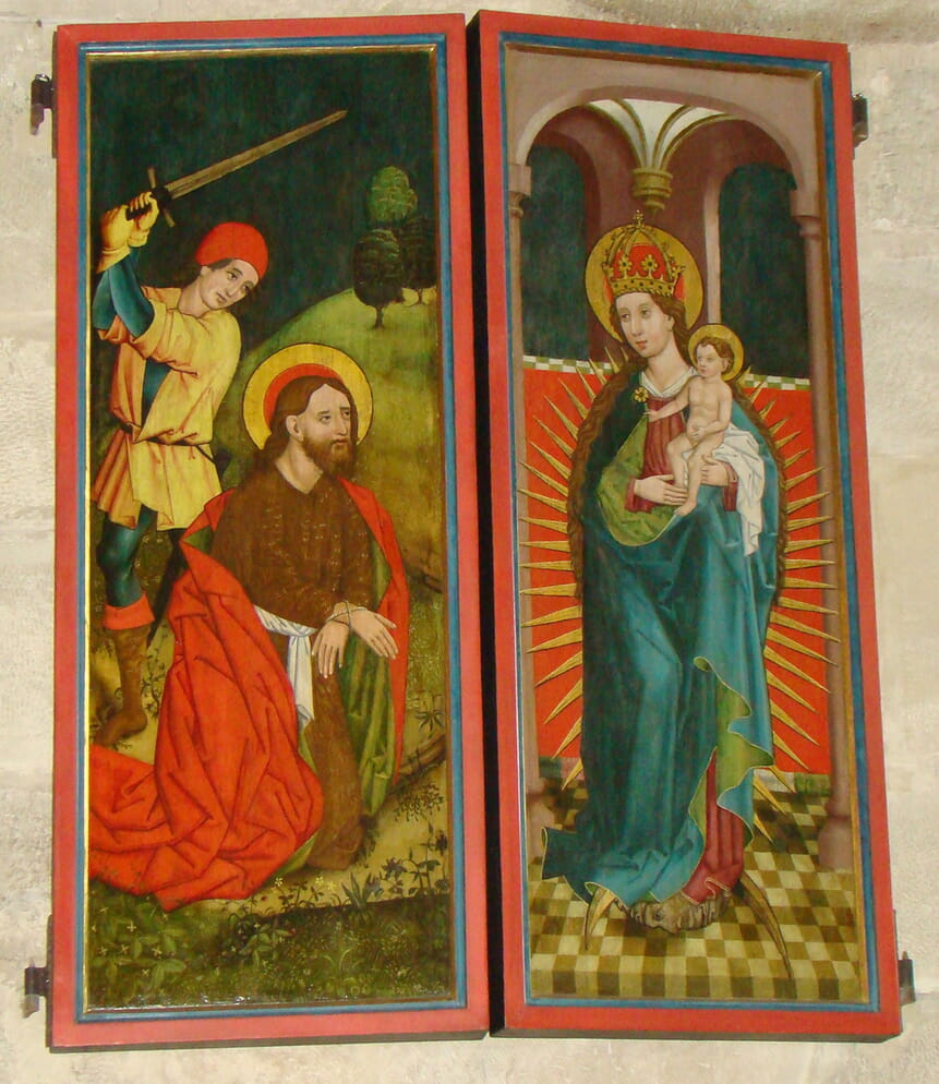 Auf den Außenseiten der Flügel sind die Enthauptung Johannes des Täufers sowie eine apokalyptische Madonna zu sehen. Auf der Flügelseite mit Johannes dem Täufer sind in der ihn umgebenden Landschaft zahlreiche Pflanzen naturalistisch dargestellt. Die auf der Mondsichel stehende Madonna, mit Ringnimbus und Strahlenkranz, ist hingegen in einer Architektur mit Fliesenboden, Säulen und Deckengewölbe abgebildet. Die Innenseiten der Flügel zeigen links die Taufe Jesu, rechts die Heiligen Petrus und Georg mit ihren jeweiligen Attributen: Petrus mit Papstkrone, Buch und Schlüssel, Georg in Rüstung, mit Fahne und Drachen. Die Hintergründe der Tafelinnenseiten sind jeweils einheitlich durch halbhohe Vorhänge mit reichen vegetabilen Mustern gebildet.