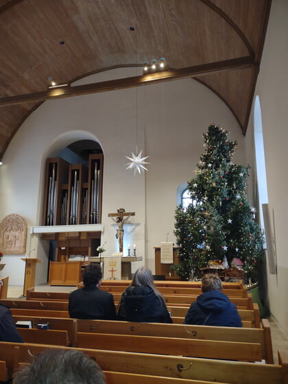 GD am 25.12.25 mit Pfarrerin Binder und dem Kirchenchor unter Leitung von Herrn Heffter, der auch die Orgel spielt