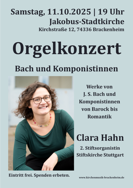 Am Samstag, 11.10. gastiert um 19 Uhr in der Jakobus-Stadtkirche Brackenheim die Stuttgarter Organistin Clara Hahn mit dem Programm „Bach und Komponistinnen“.